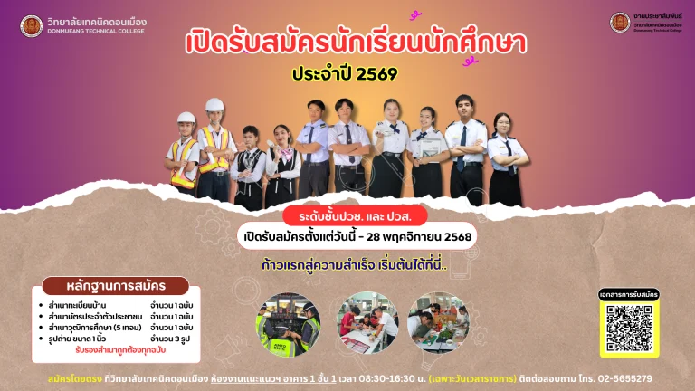 ประกาศวิทยาลัยเทคนิคดอนเมือง เรื่อง เปิดรับสมัครนักเรียนนักศึกษาใหม่ ประจำปีการศึกษา 2569 “รอบโควตา”