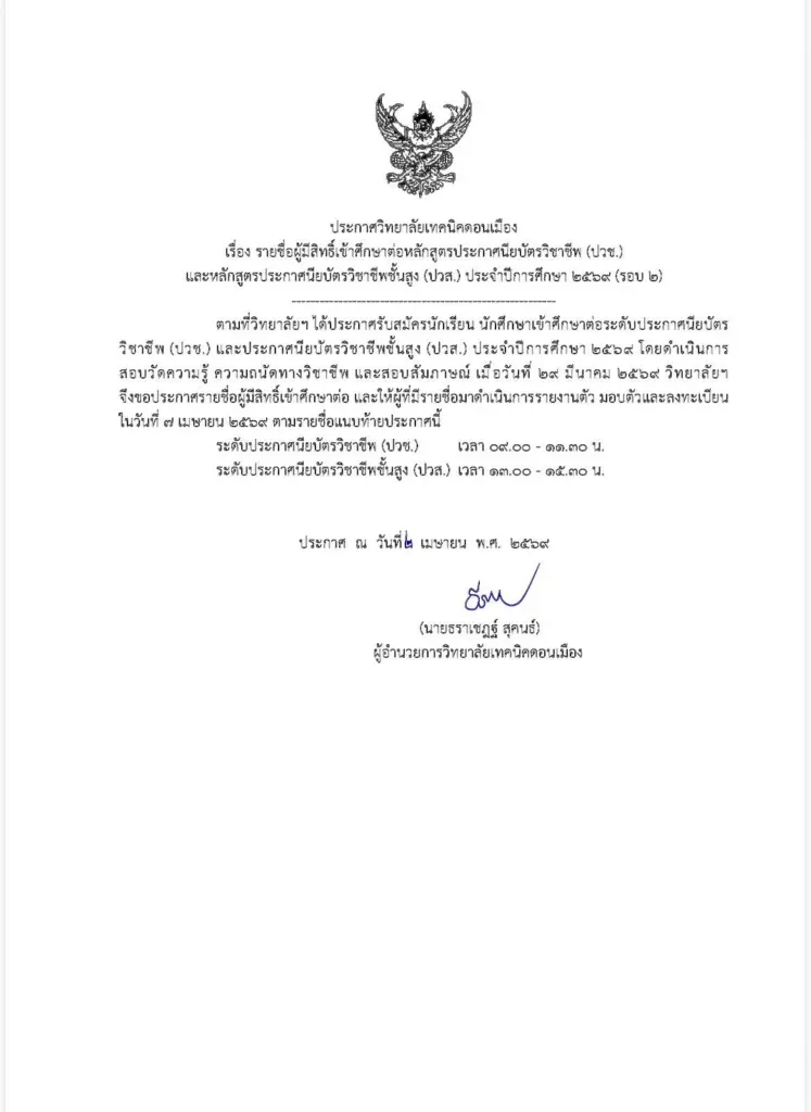 ประกาศวิทยาลัยเทคนิคดอนเมือง เรื่อง รายชื่อผู้มีสิทธิเข้าศึกษาต่อ ระดับ ปวช.และปวส. รอบที่ 2 ภาคเรียนที่ 1 ปีการศึกษา 2569 ตามรายละเอียดต่อไปนี้